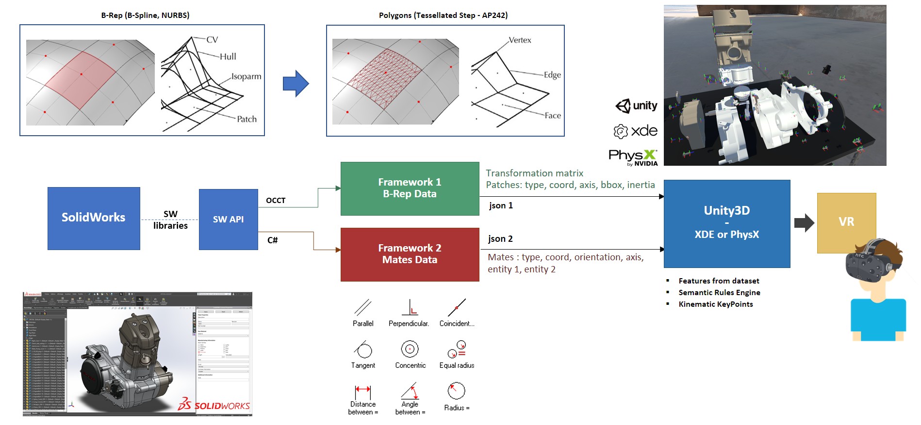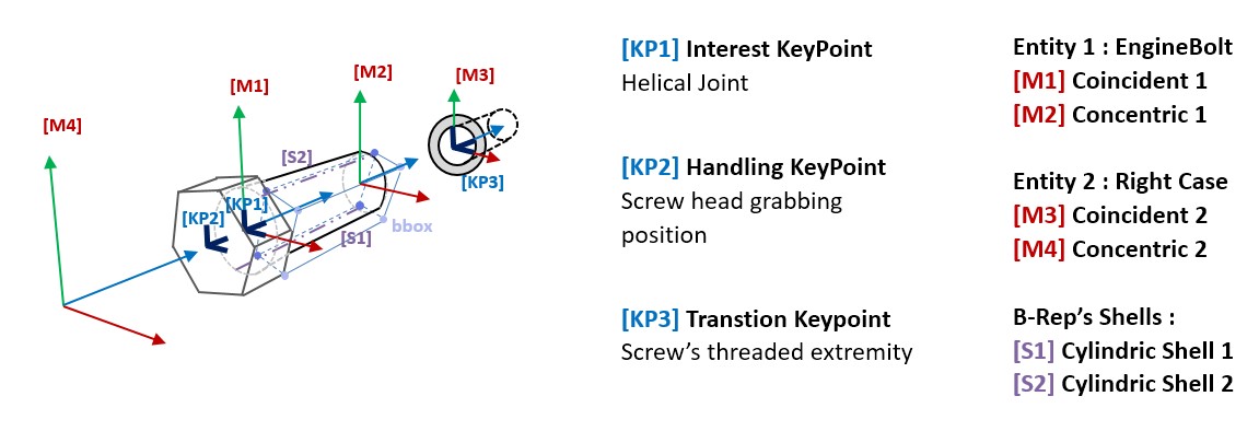 Le projet se concentre sur une nouvelle méthode pour générer et modéliser des caractéristiques sémantiques (liaisons cinématiques notamment) dans les l'assemblage 3D numérique afin d'optimiser le temps de préparation des simulations en réalité virtuelle. L'approche proposée est basée sur un ensemble de règles heuristiques points clés cinématique nommés "KeyPoints" (caractérisations dans l'espace de lien cinématique ou d'un contact) utilisés pour idéaliser un modèle 3D dans un moteur physique. Cette étude identifie à travers un processus de désassemblage un certain nombre de règles sémantiques regroupé. L'approche proposée est basée sur deux étapes : l'extraction des caractéristiques d'assemblage dans un premier temps et l'exploitation de ces caractéristiques par le biais d'un moteur de règles dans un deuxième temps. Dans la première étape, les données B-Rep (représentation géométrique des limites internes d'un objet 3D) et les contraintes d'assemblage sont extraites au moyen d'une API SolidWorks et injectée en entrée d'Unity3D. Dans un deuxième temps, un modèle de règles sémantiques à plusieurs niveaux est utilisé pour identifier et générer de façon automatique les différents KeyPoints dans la scène Unity. Ces keypoint sont ensuite utilisé pour simuler l'ensemble des comportements et des actions attendues. L'approche est démontrée et validée sur un cas d'utilisation avec un scénario de désassemblage et adaptée à la réalité virtuelle.
